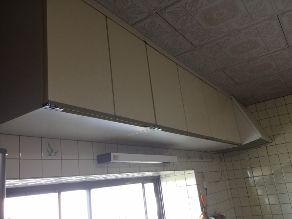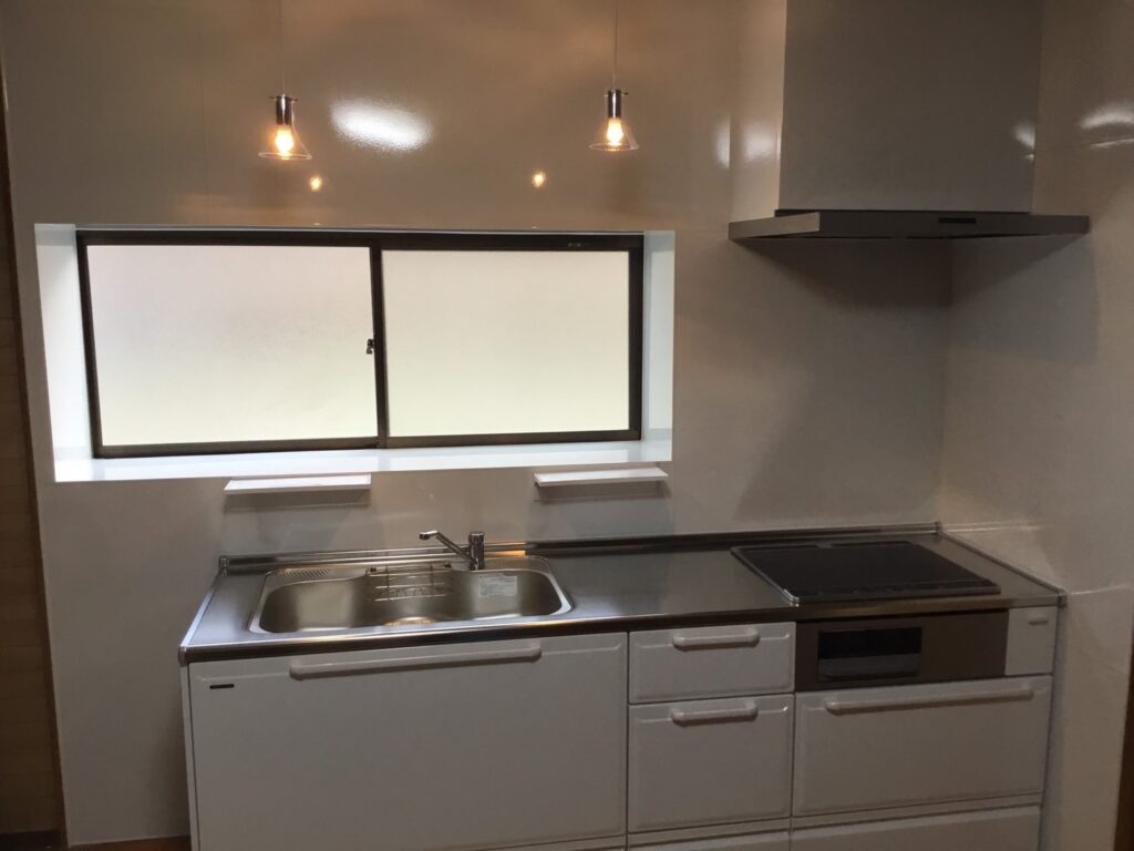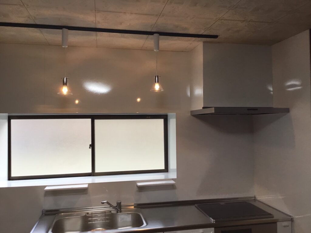 吊戸無し、開き戸から引出へ、横の長さも30㎝短く、照明は、レール付きへと変貌を遂げました。