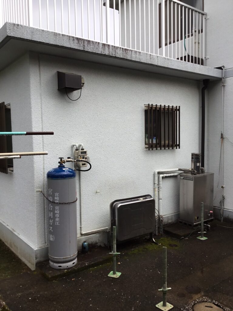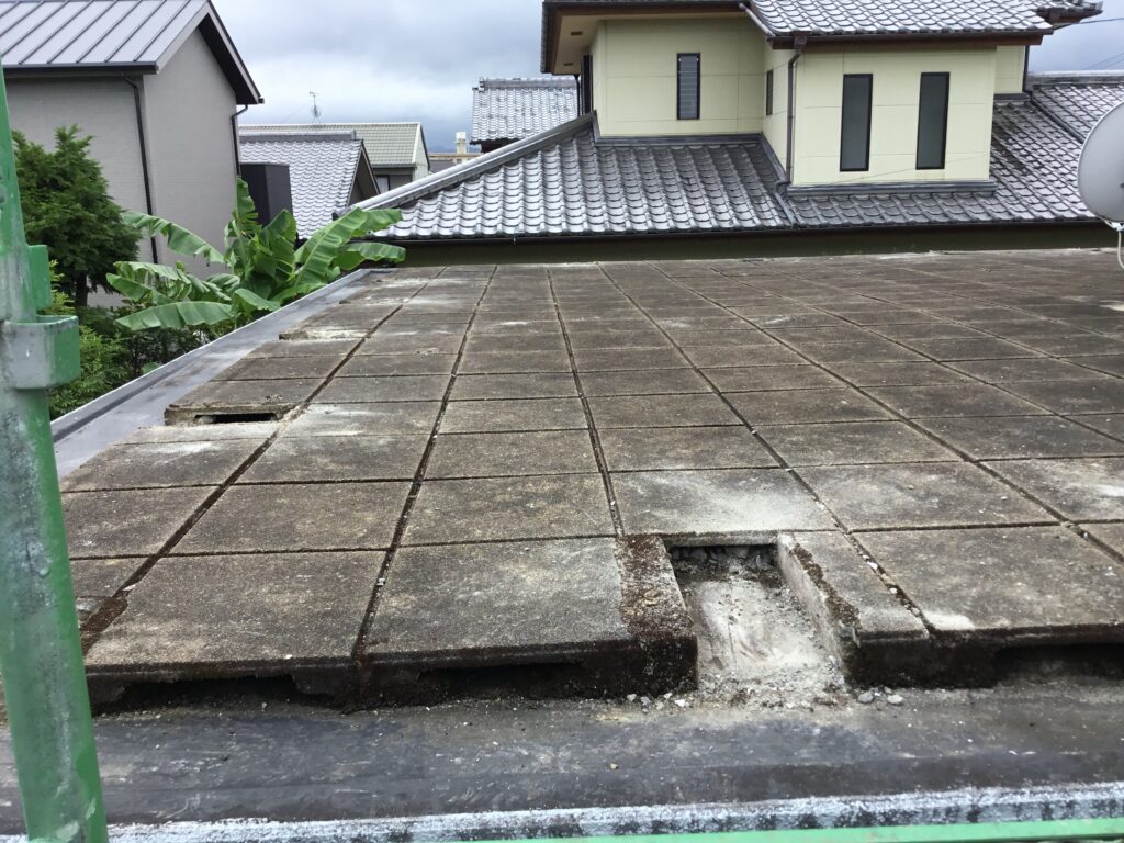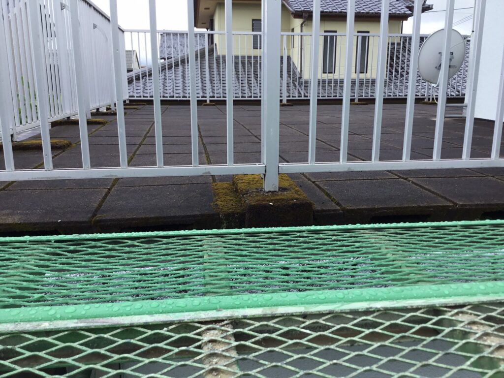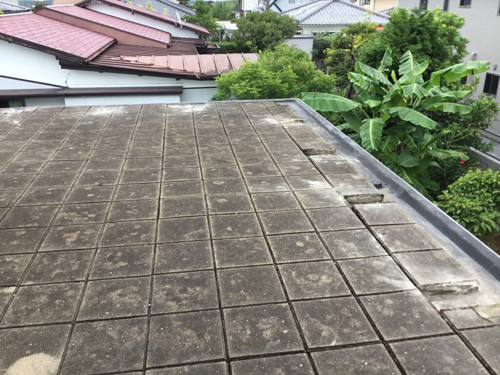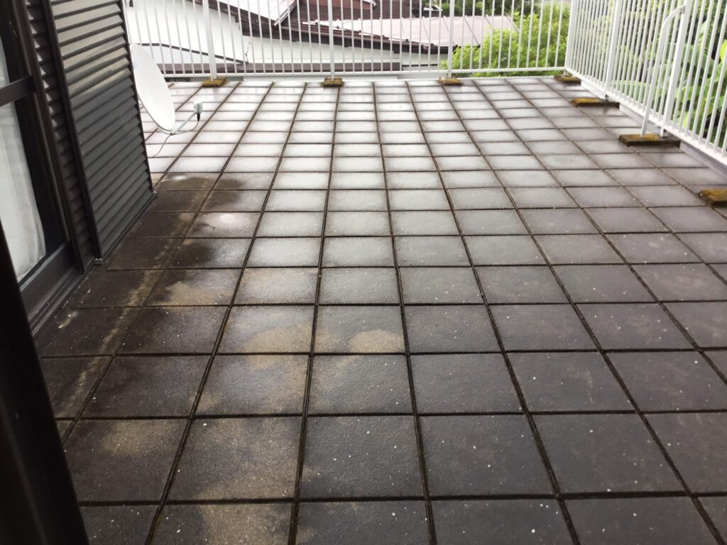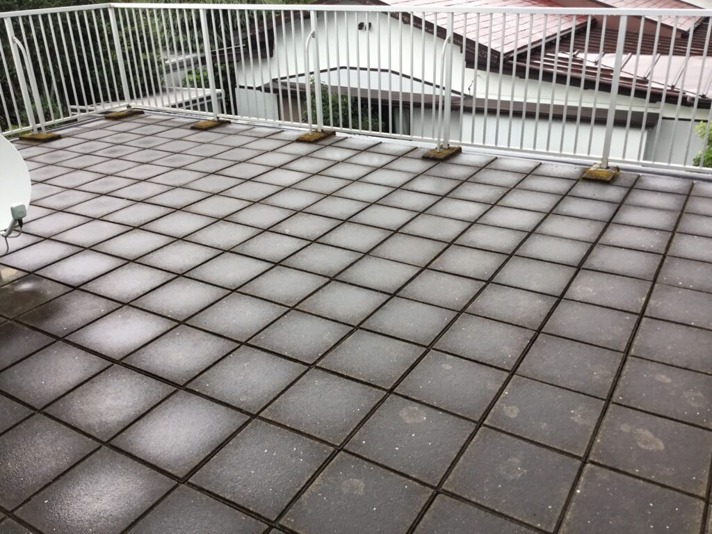 ベランダ床部分のブロックを撤去し、雨漏り箇所の補修後、FRP防水塗料を塗布して完了しました。