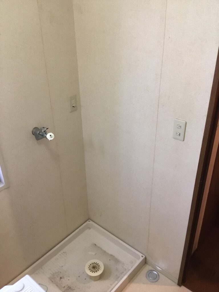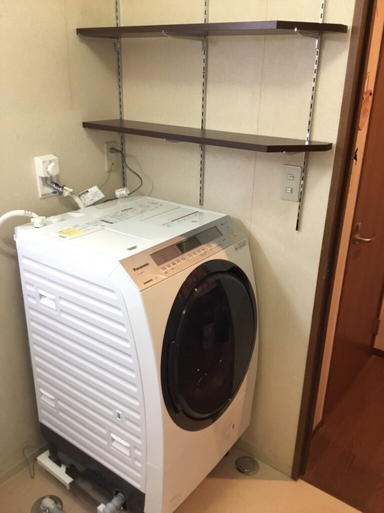新たに壁に棚の作成、洗濯水栓入替、排水トラップ入替を行いました。