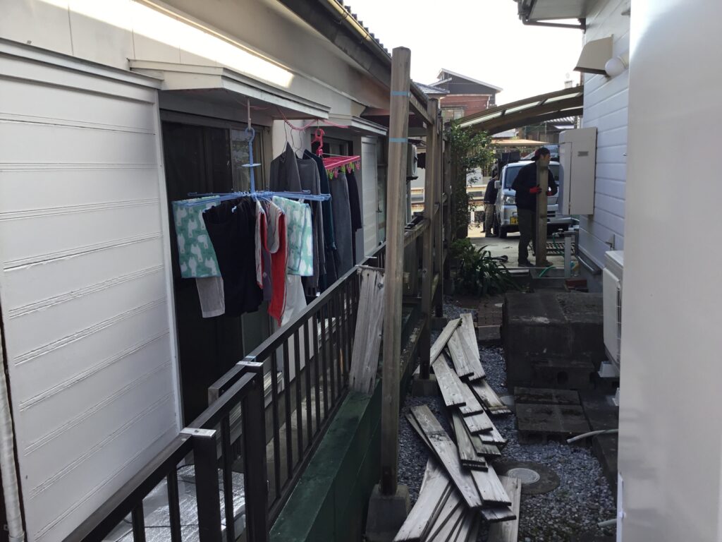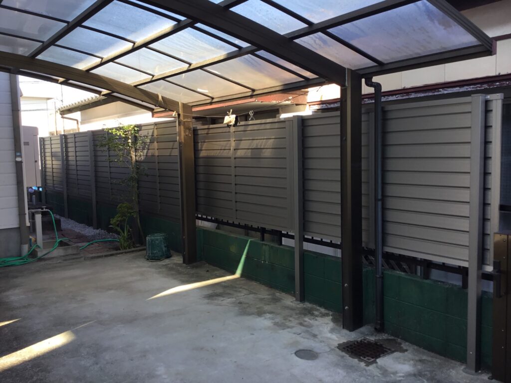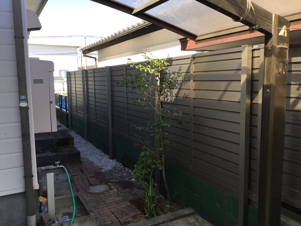 台風災害で、飛んで破損したウッドフェンスを、LIXIL製のアルミフェンスに入替を行いました。