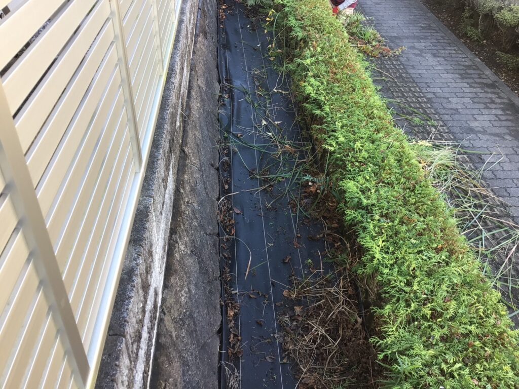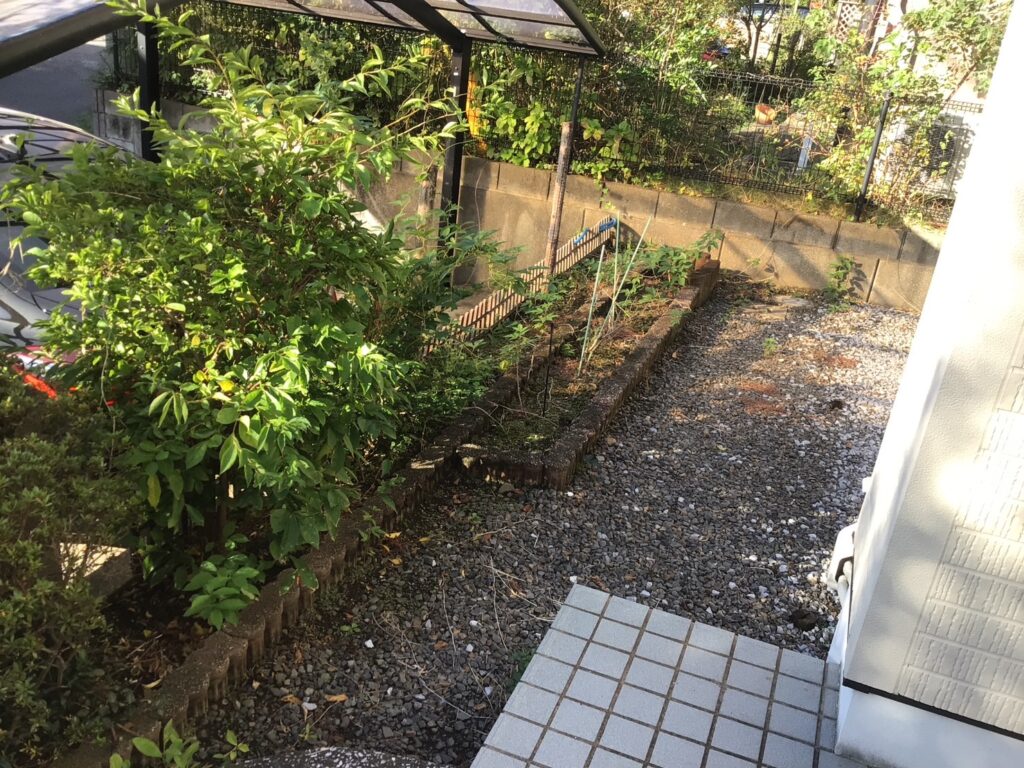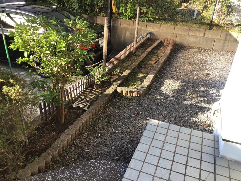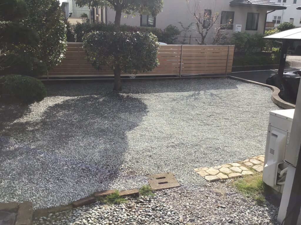 玄関間先の庭は、土を入れた後に防草シートを敷いて砂利を入れました。