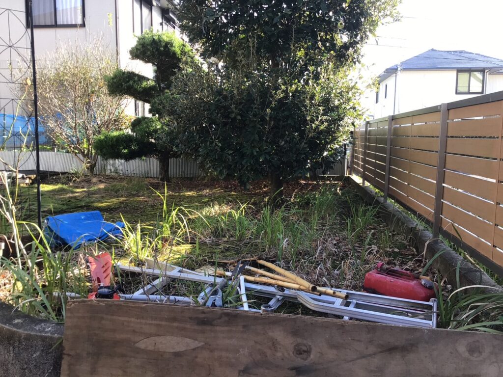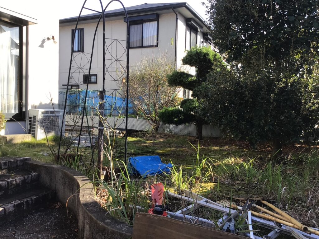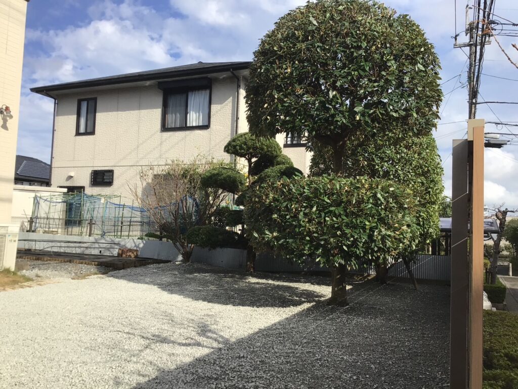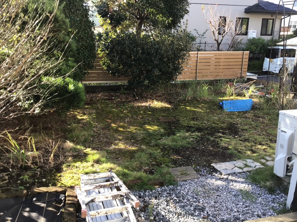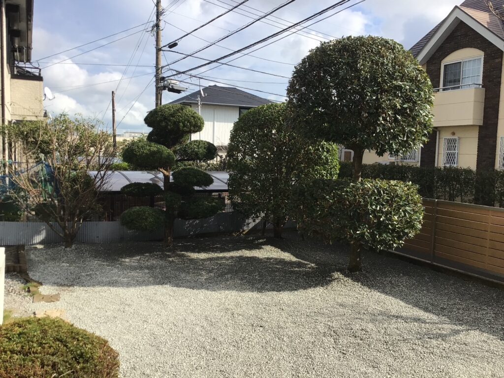 玄関間先の庭は、土を入れた後に防草シートを敷いて砂利を入れました。