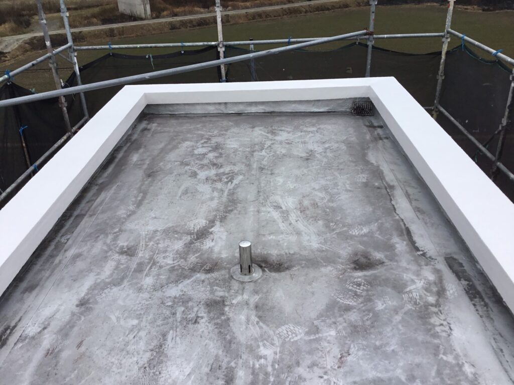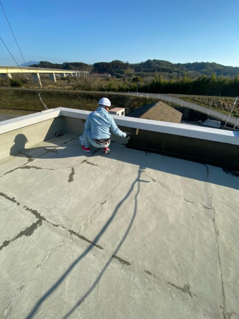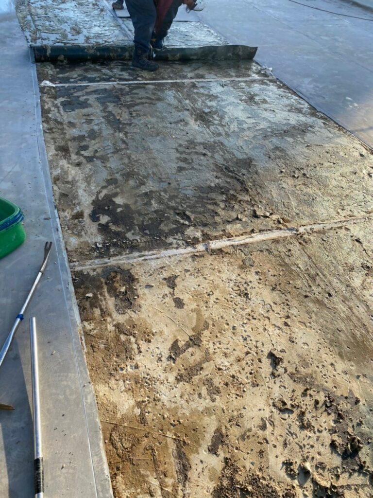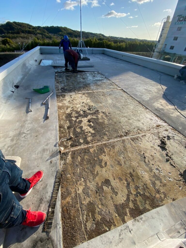 既存の防水シートを剥ぎ、ひび割れ箇所へコーキング打ち、メッシュ防水シートを貼り、