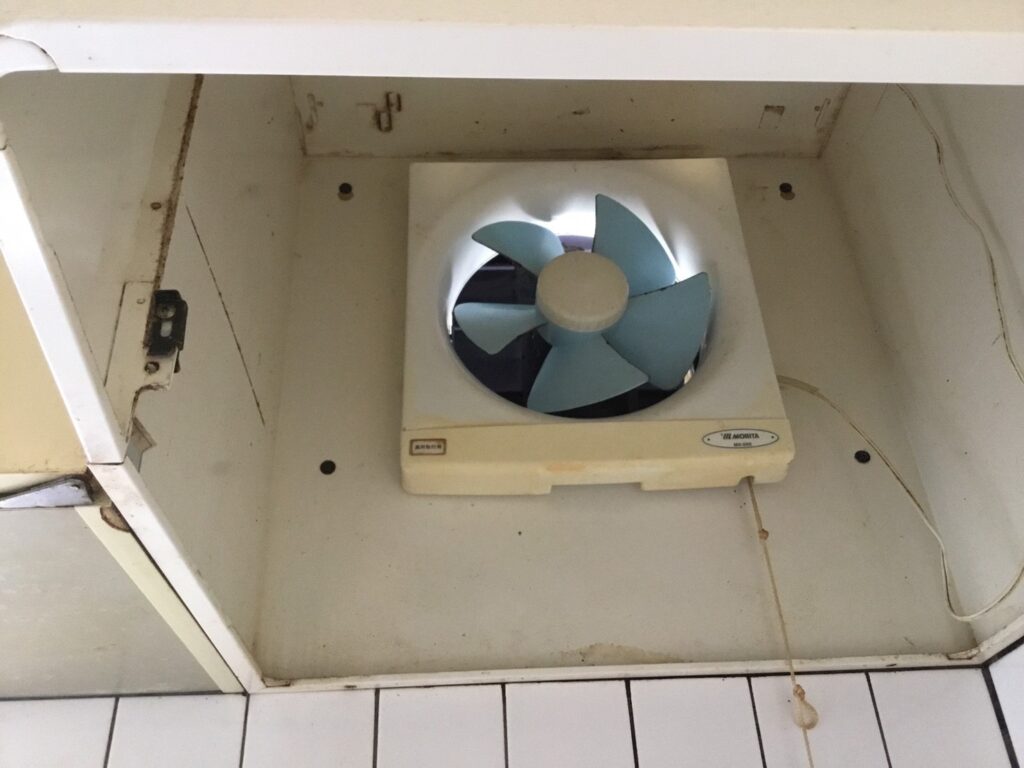 換気扇はプロペラ式、壁はタイルとお手入れが大変でした。