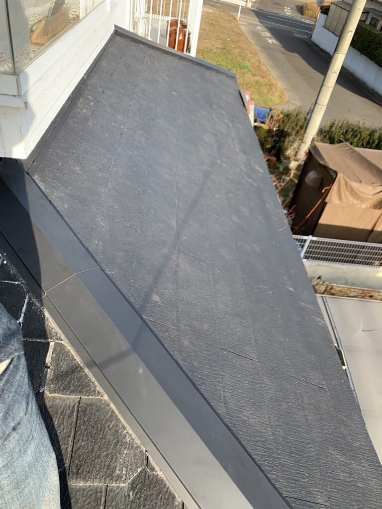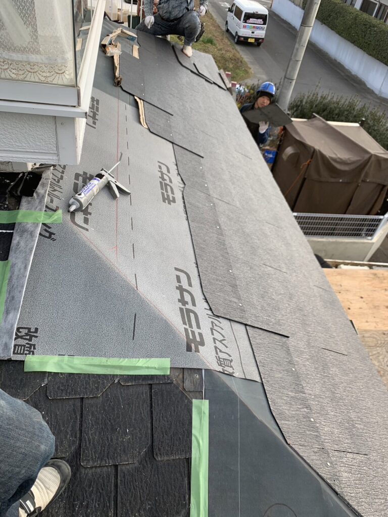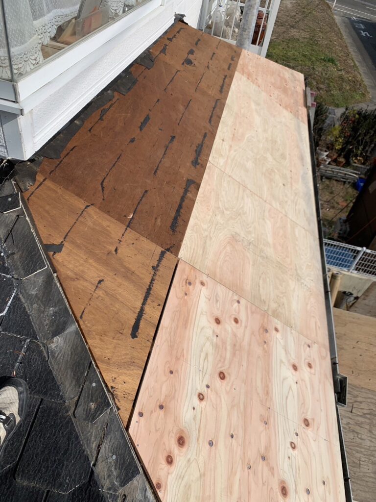 現在のスレート瓦を剥ぎ、防水シートを取替、新たなスレート瓦を貼り、