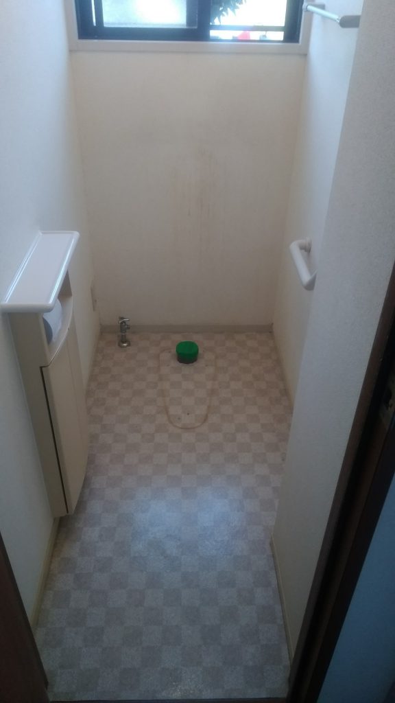 作業内容は、既存の便器を外し、既存のクロス&CF張替の外し、新設の張替、新設の便器