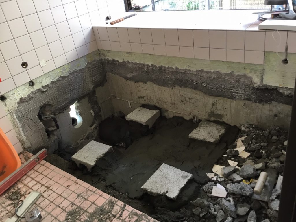 既存の浴槽を取外し、底上げをし、高さが20㎝低く、幅が30㎝長いポリバスを設置させて頂きました。