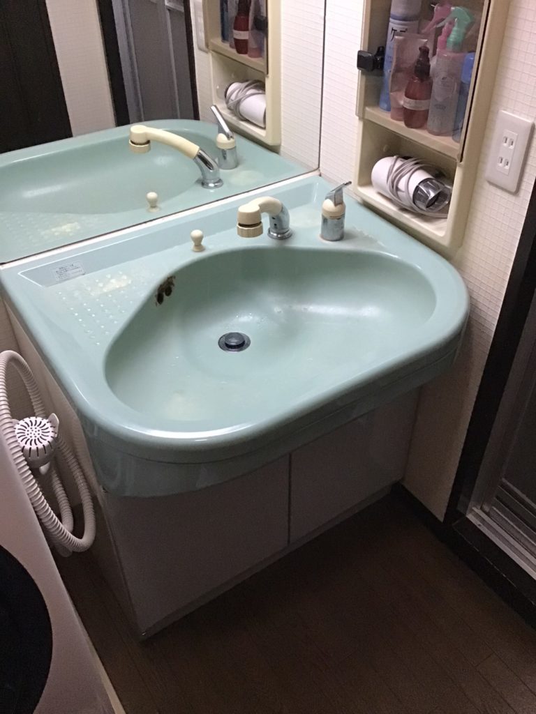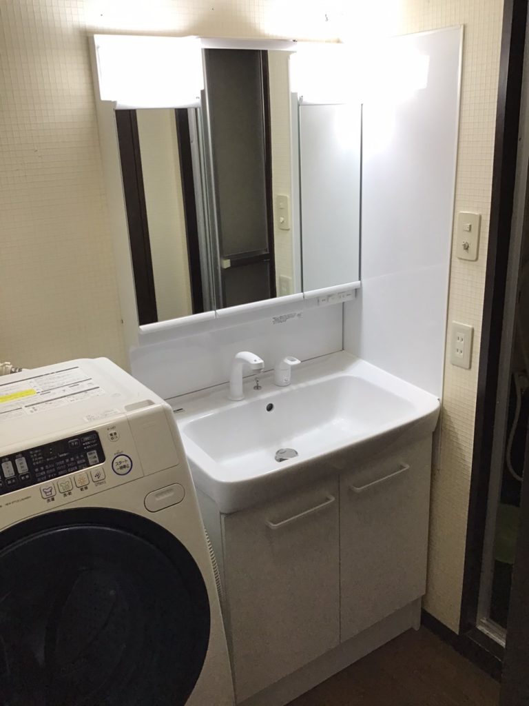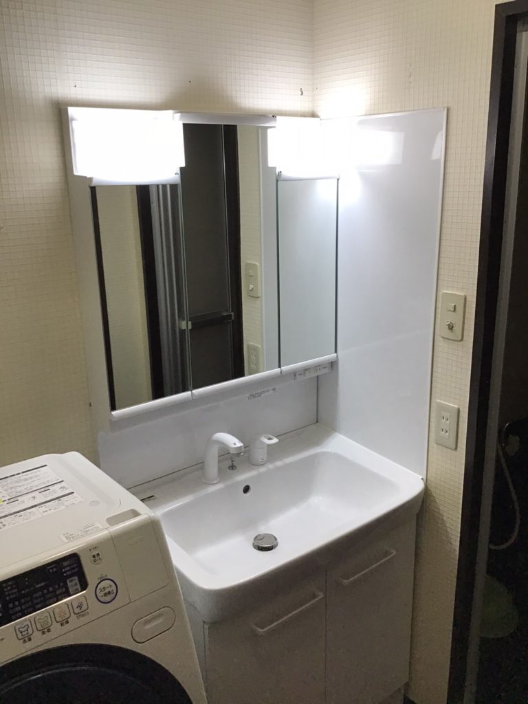 宮崎市の洗面化粧台リフォーム 「洗面化粧台横にパネルを貼り、水撥ねにも対応しました。」